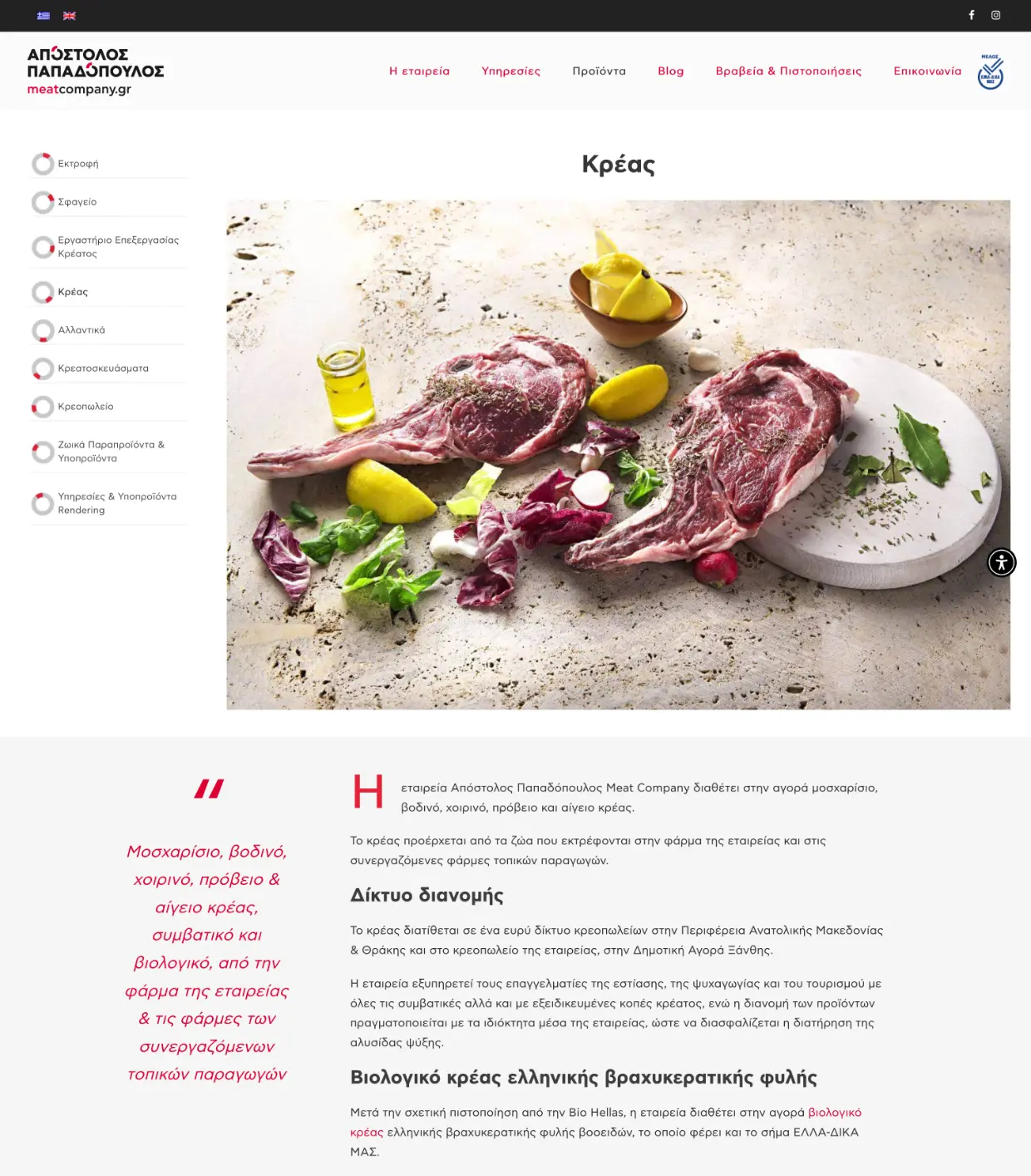 Για την Απόστολος Παπαδόπουλος Meat Company έχουμε αναλάβει και την ετήσια φιλοξενία & υποστήριξη του website. Αυτό το πακέτο αφορά ένα πλήθος υπηρεσιών αλλά στη συγκεκριμένη περίπτωση είναι πιο διευρυμένο από το συνηθισμένο με ακόμα περισσότερη υποστήριξη στη διαμόρφωση του περιεχομένου.